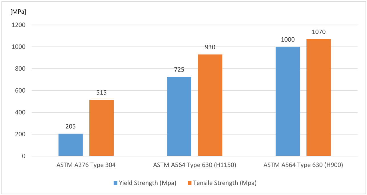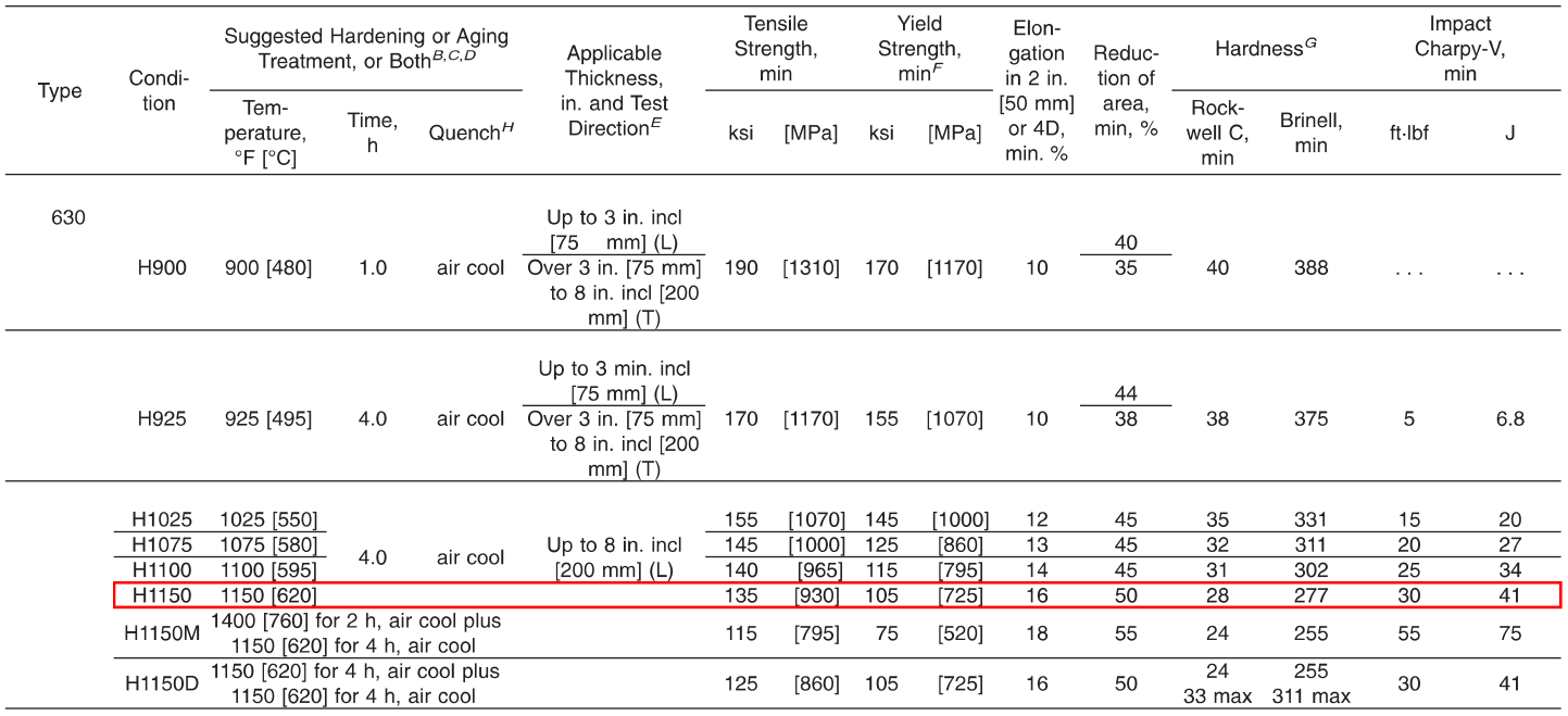 SUS630은 마르텐사이트계 석출경화형 스테인리스 강으로서 매우 우수한 강도와 내식성을 보인다. SUS630의 석출경화는 1020~1060 deg.C 에서 급냉 (용체화 열처리) 후 482~760 deg.C 사이에서 1~4 시간 시효처리를 하고 공냉하는 방법으로 이루어지는데 1회만 하면 재료의 특성이 충분히 향상되므로 단일 열처리 마르텐사이트 강이라고도 한다.