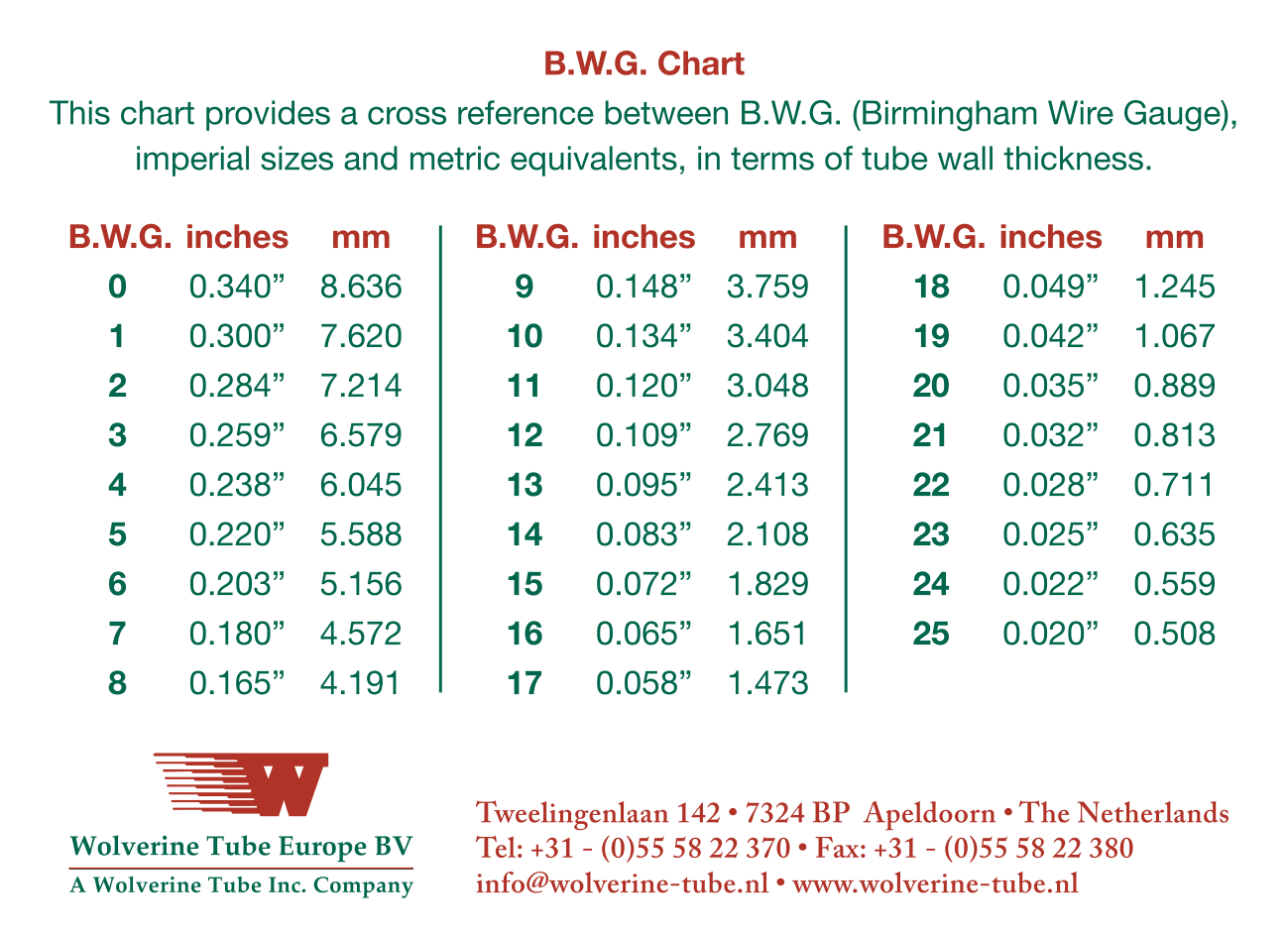 This chart provides a cross reference between B.W.G. (Birmingham Wire Gauge), imperial sizes and metric equivalents, in terms of tube wall thickness.